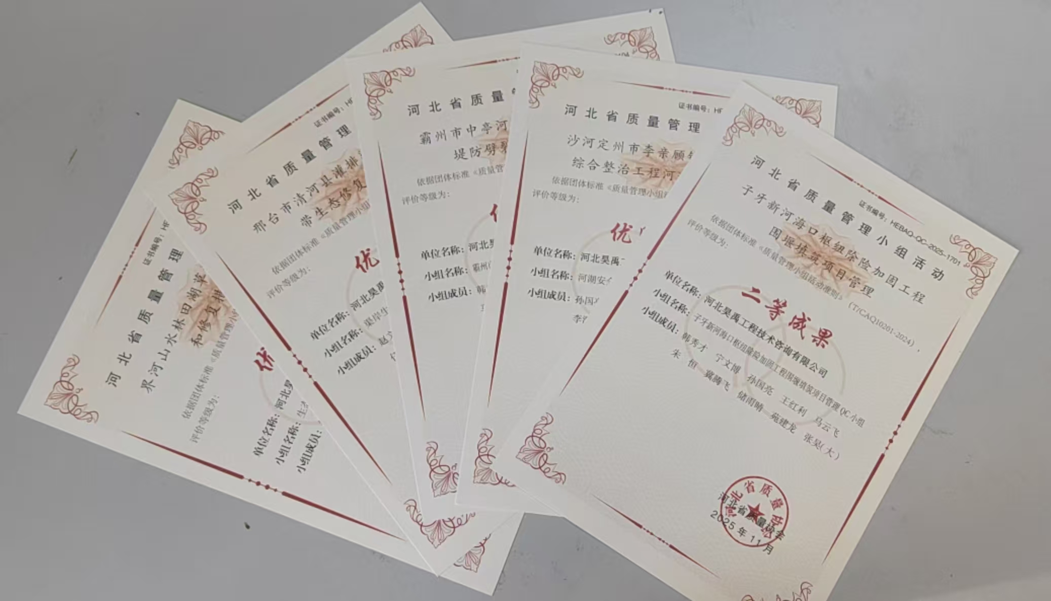 日前,河北省质量协会公布了2025年度河北省群众性质量管理活动成果,昊禹公司《子牙新河海口枢纽除险加固工程围堰填筑项目QC小组》荣获二等成果、《霸州市中亭河水毁修复工程加强堤防劈裂灌浆质量控制QC小组》、《邢台市清河县灌排渠系渠岸缓冲带生态修复研究措施QC小组》、《界河山水林田湖草沙一体化保护和修复措施研究QC小组》、《沙河定州市李亲顾镇下游段防洪综合整治工程河道分流比复核QC小组》4项成果荣获优胜成果。
